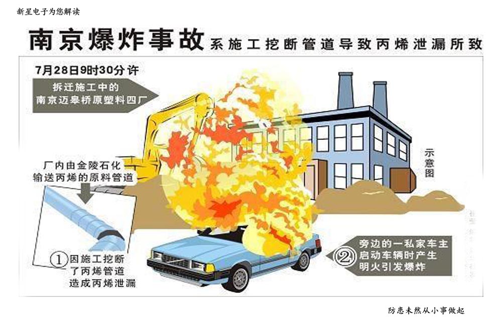 事故原因現(xiàn)已初步查明,施工人員在原南京塑料四廠廠區(qū)場地平整施工中,挖掘機械違規(guī)碰裂地下丙烯管線,造成丙烯泄漏,與空氣形成 爆炸性混合物,遇明火后發(fā)生爆燃。